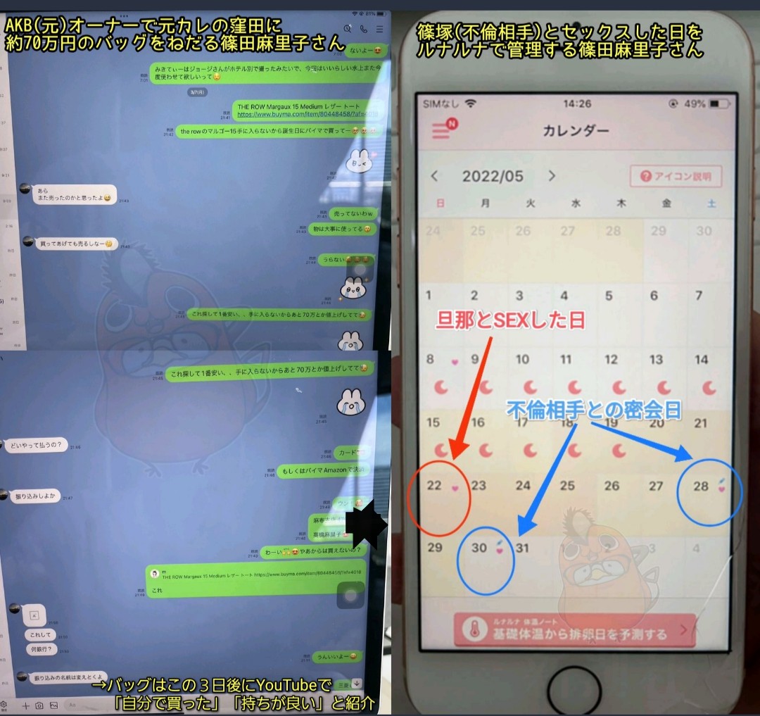 不倫騒動の渦中にある篠田麻里子ですが、更に音声とLINEが流出したようです。特にLINEには元カレにに70万円のバッグをねだるメッセージが残っており、渦中の浮気相手以外にも関係をもっているのではと話題になっています。しかもその元カレというのが元AKS社長、元AKB48プロジェクト・エグゼクティブプロデューサーで現在は女性向け風俗店の顧問してる窪田氏。全部、つながってしまいヤバすぎですね。⋈