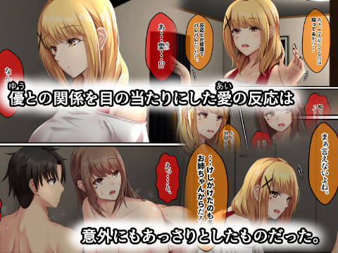 | 一度やった後は歯止めがきかなくなって、何度もやりまくります。姉の情事を聞いて、妹はどうするのか、2巻以降の展開がどのようになるにか楽しみです。 | |