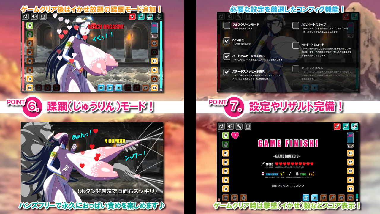 50人の攻略女性キャラを牧場に連れて帰るため、人間界で女たちをイカせまくり、牧場を完成させよう!CGは基本6枚、総CG枚数271枚で、RPGツクールMVで製作されています。