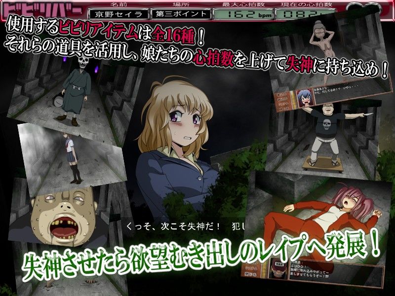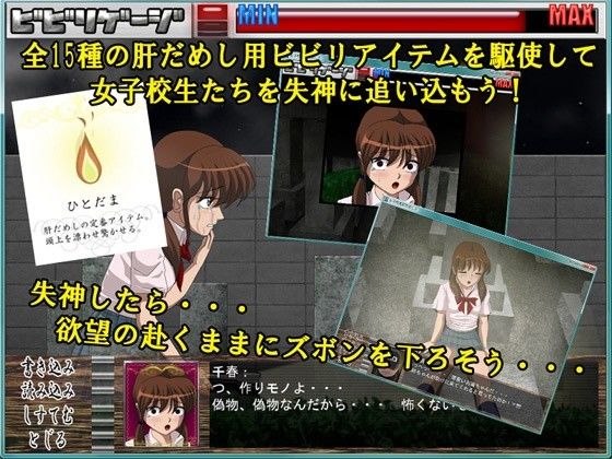 ビビリアイテムを駆使し、女たちを驚かせ心拍数が上がり失禁失神させる。
