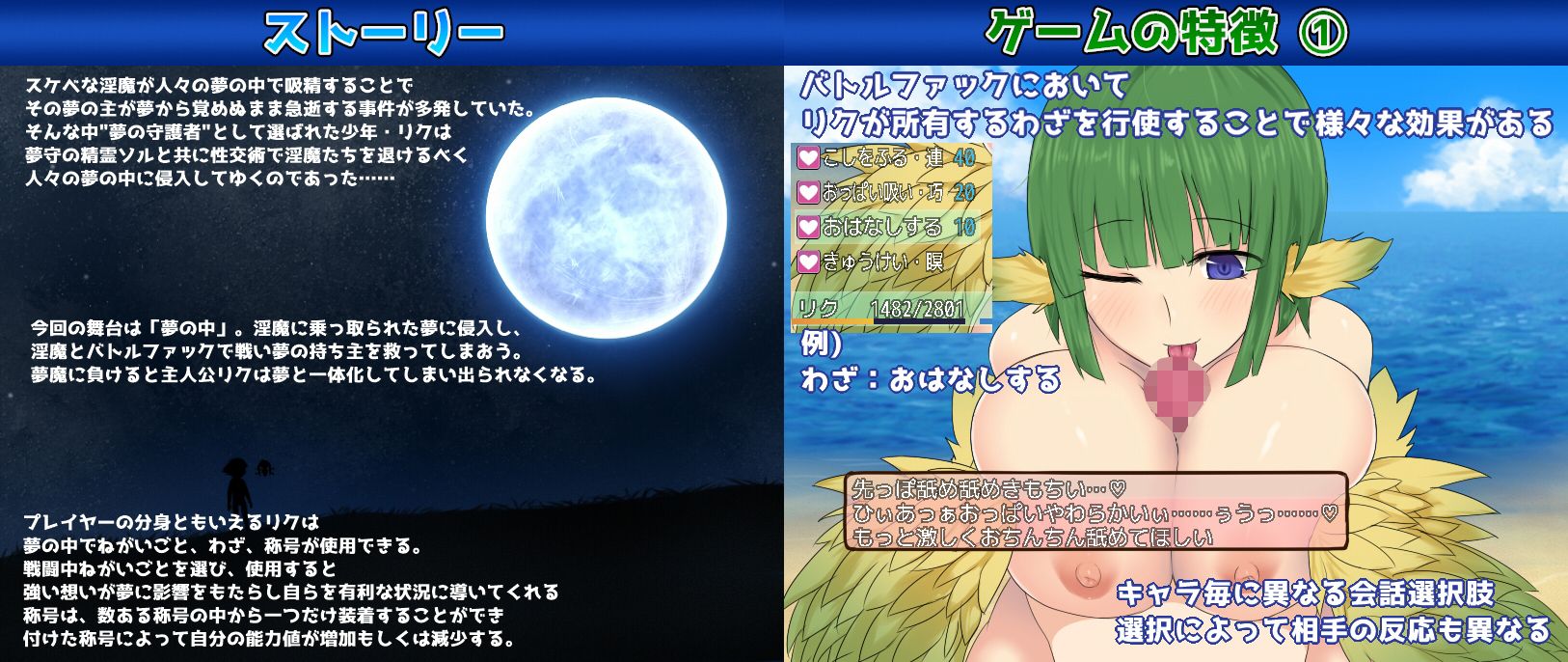 SEXで戦う真剣勝負やエロいバトル、自由に強化できる育成モードなどが展開される。