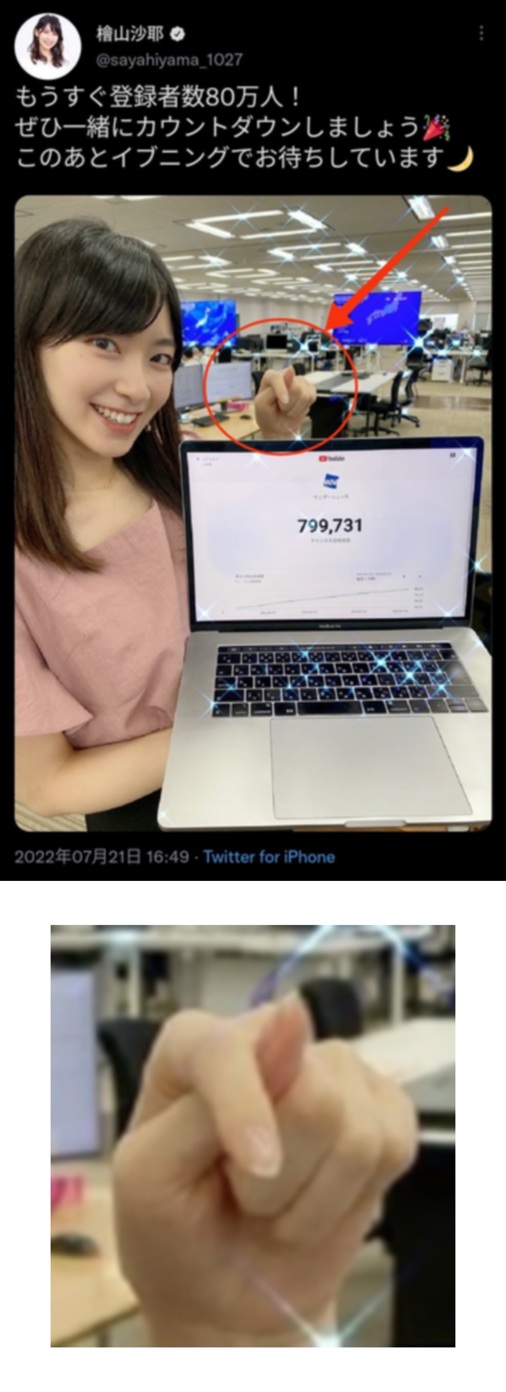 女子アナウンサーより綺麗な人が多いような気がするお天気キャスター業界ですが、2018年7月に、ウェザーニュースLiVEキャスターオーディションに合格し、お天気キャスターとしてウェザーニューズに入社した檜山沙耶さんも綺麗系お天気キャスターです。そんな檜山沙耶さんが、Youtubeのウェザーニュースチャンネルの登録者数が、もうすぐ80万人という時にエッチな指サインしちゃいました。Twitterでその画像を掲載したのですが、視聴者に指摘されたようです。さて、檜山沙耶さんはこの指のポーズの意味を知っているのでしょうか???
