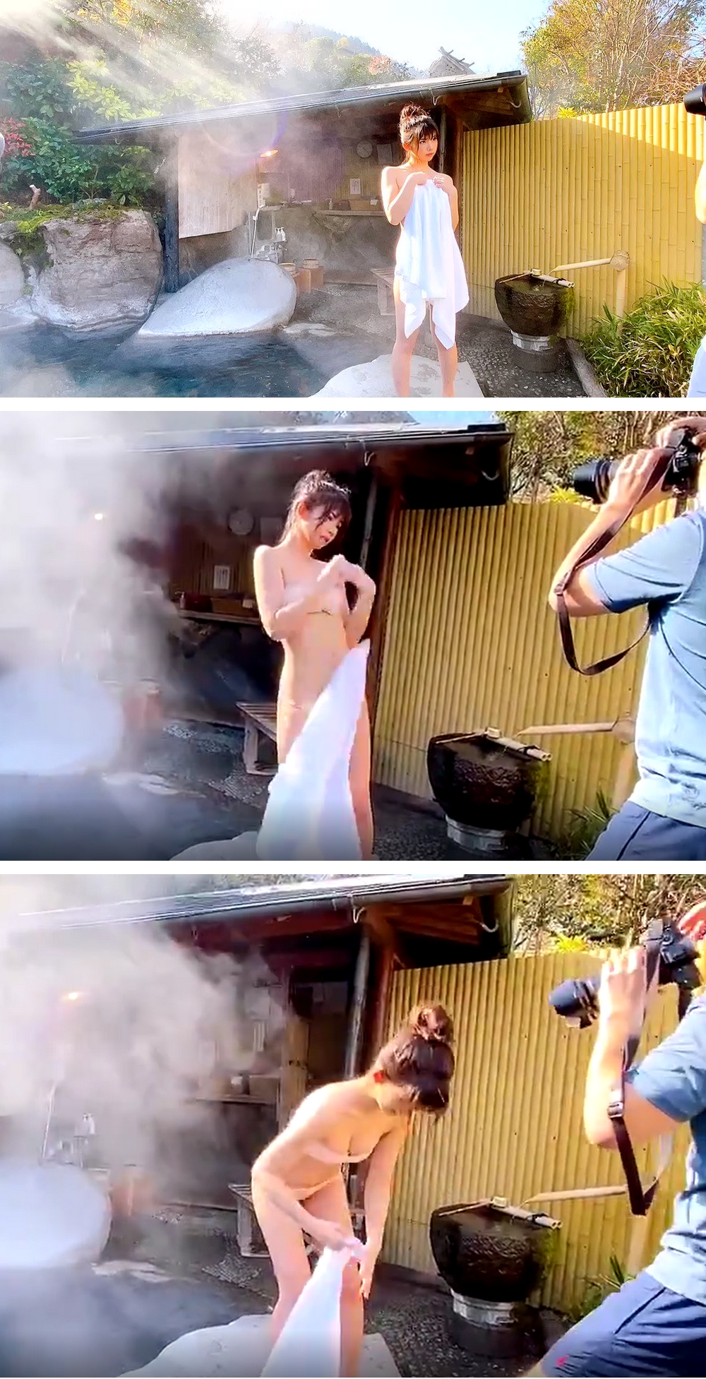 バスタオル一枚の姿で露天風呂の前に立って、カメラ撮影されている日本一のコスプレイヤーえなこさんですが、そのバスタオルを地面に落としてしまいました。さすがにカメラマンもビックリしています。まぁ、流石にすっ裸ではないですが、ベージュ色のビキニがエロいですな。ちなみに、本人曰く、「腕のトレーニングしてないのに握力40あるオンナなのであまり怒らせないように」と、意外な秘密を明かしています。腕の筋肉がモリモリ状態ナンデス えなこさん、水着が小さすぎた結果・・・