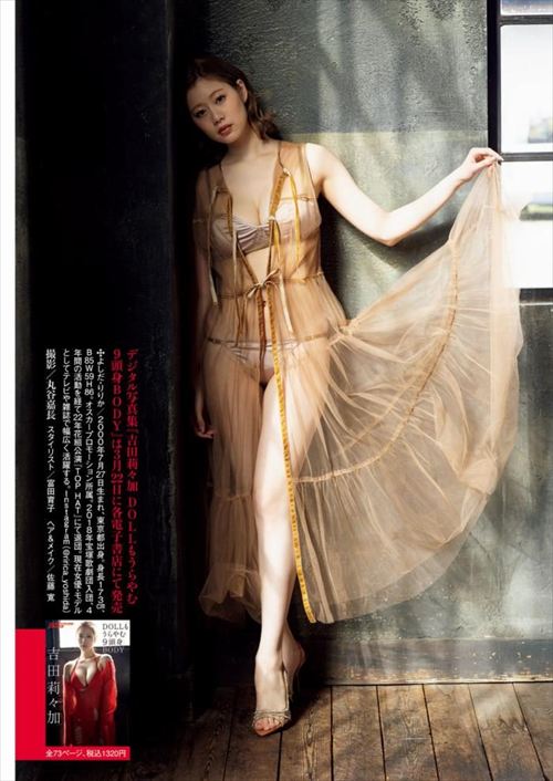 吉田莉々加のグラビアは、ダイナミックかつ繊細。自信に満ちた表情と流れるようなポーズが、唯一無二の美を表現している。