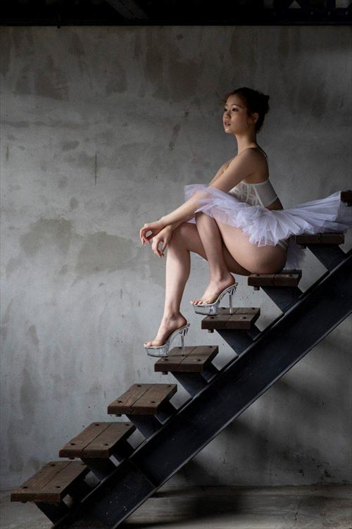 彼女の写真は、力強い美脚と柔らかな曲線美が印象的。シンプルな背景が、彼女のダイナミックな魅力をより強調している。