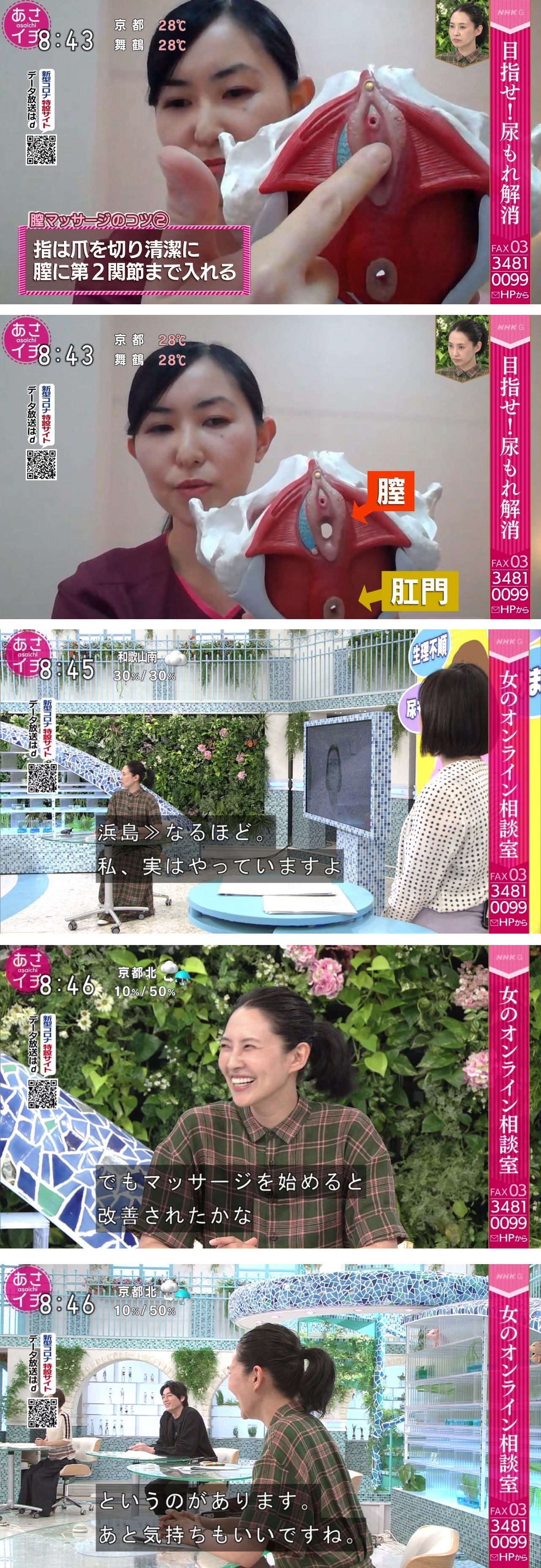 Youtube動画の中でも女性器や男性器が写っていても医学に関するものはバンされずに残っていますが、NHKでは定期的に医学に関することを放送してくれています。リンク先で紹介してくれている情報は、NHKで放送された膣マッサージを紹介する画像です。膣マッサージって・・・オナニーじゃん・・・(;´∀`) 実は尿もれ防止のマッサージらしいですが、指の爪を切り清潔にし膣の中に第二関節まで入れるって・・・右上のワイプ画像の女性が可哀想です・・・久しぶりのセックスでアソコが大洪水になっちゃったGカップ人妻はコチラ