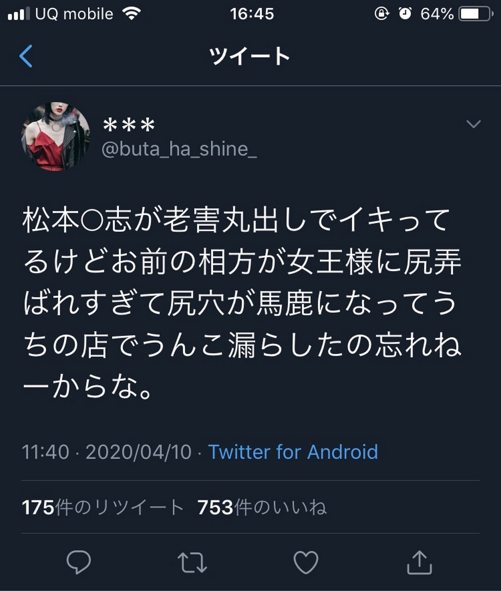 何故か一人のある風俗嬢さんが、「松本○志が老害丸出しでイキってるけどお前の相方が女王様に尻弄ばれすぎて尻穴が馬鹿になってうちの店でうんこ漏らしたの忘れねーからな。」とTwitterで怒り爆発していますが、ダウンタウン松ちゃんは何も影響はなく、とばっちりで相方の浜ちゃんが撃沈状態です。まぁ、タレントさんも風俗で遊ぶとは思いますが、それを暴露しちゃアカンですよ!
