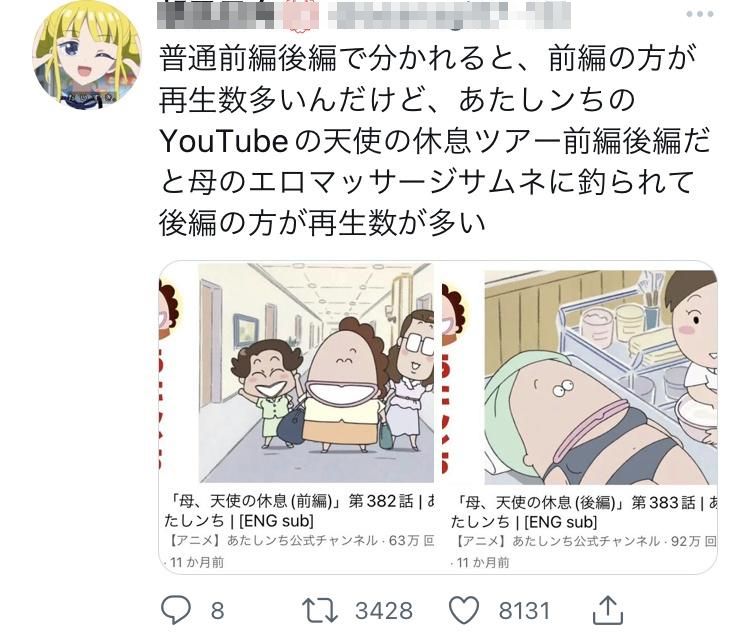 YouTubeキッズ、「あたしンち」の母のエロマッサージに釣られてしまった模様・・・再生数が伸びない後半動画が母マッサのおかげで前半の1.5倍になっています・・・こういう乳首ポロリが結局一番エロいです。