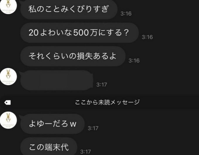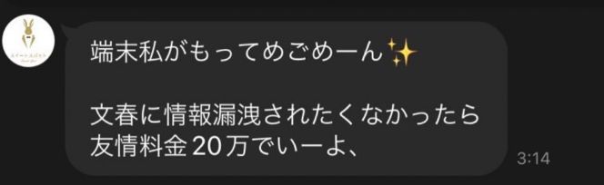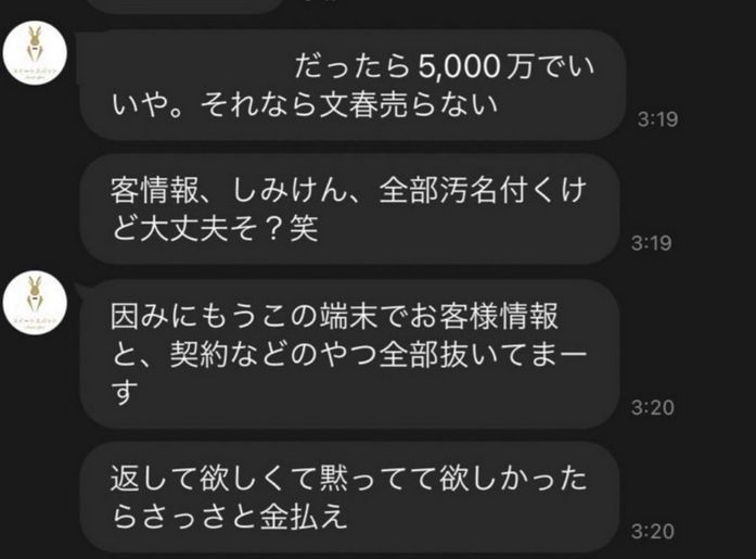 〈文春に情報漏洩されたくなかったら友情料金20万でいーよ〉〈(店の売上額を提示した上で)●●●だったら5,000万でいいや。それなら文春売らない〉