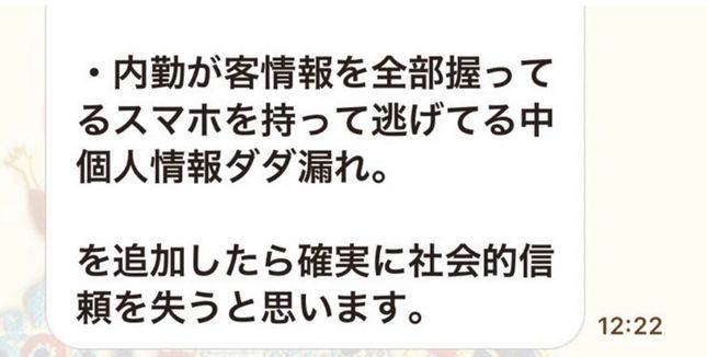 「恐喝があったのは事実です。客やセラピストの個人情報が入った社用スマホと事務所の鍵を持ち出したアルバイトの女性スタッフが『返してほしければ金を出せ』と脅してきました」