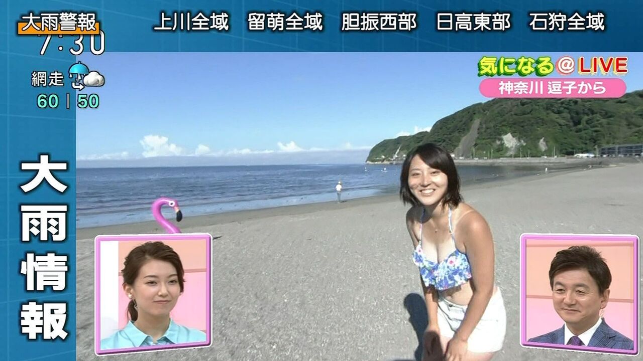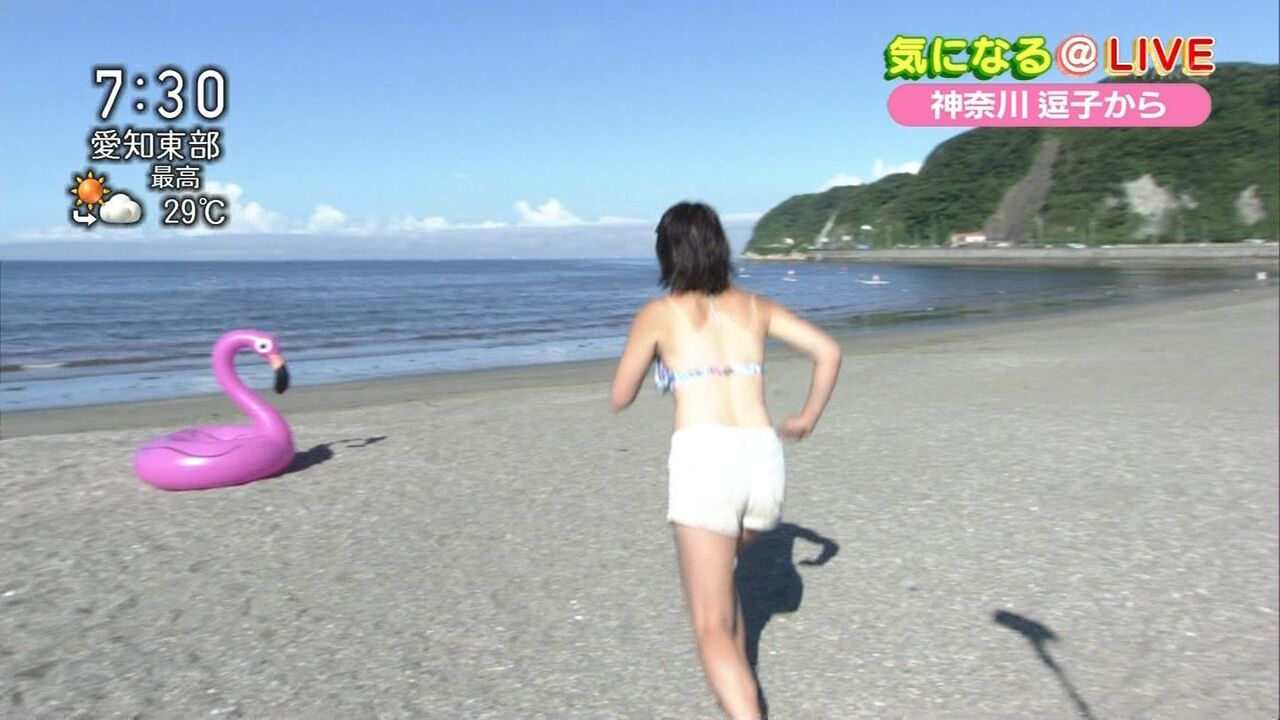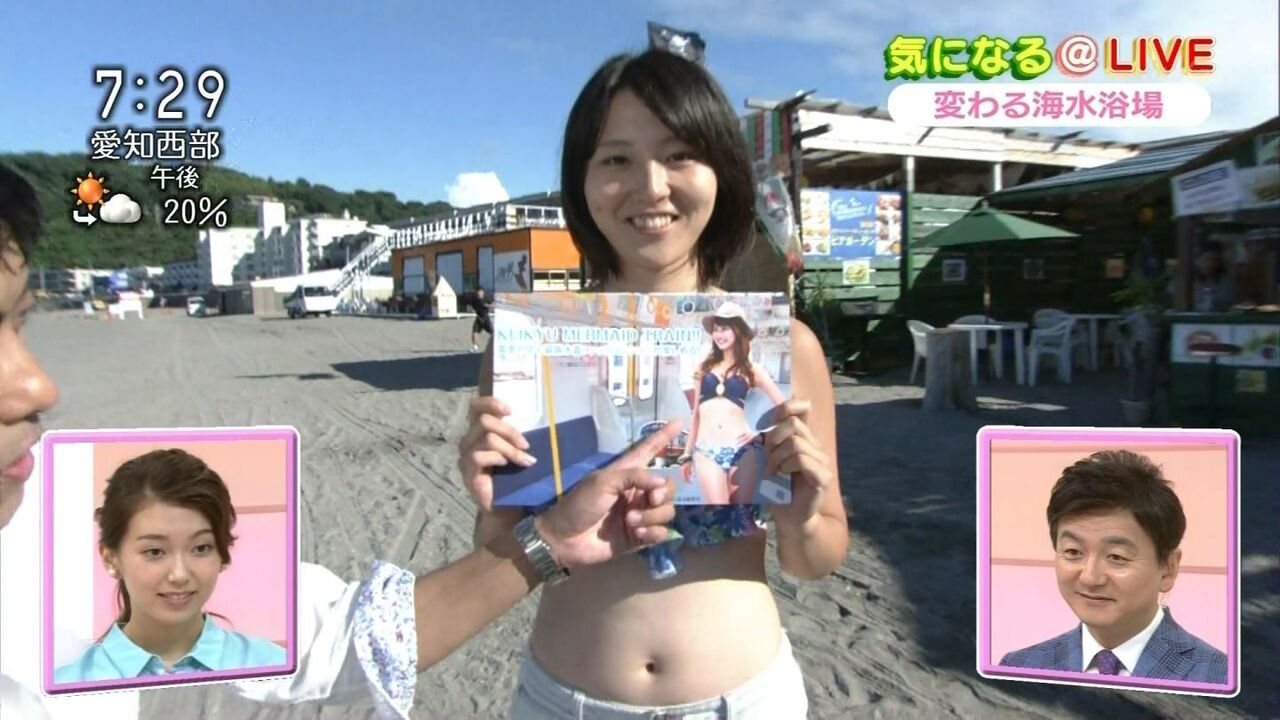 女子アナが水着で生中継するも、おっさん達が集まってくるww