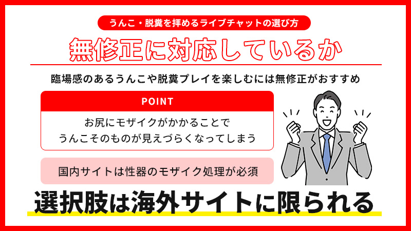 臨場感のあるうんこや脱糞プレイを楽しみたい場合は、無修正に対応しているライブチャットを選ぶのがおすすめです。