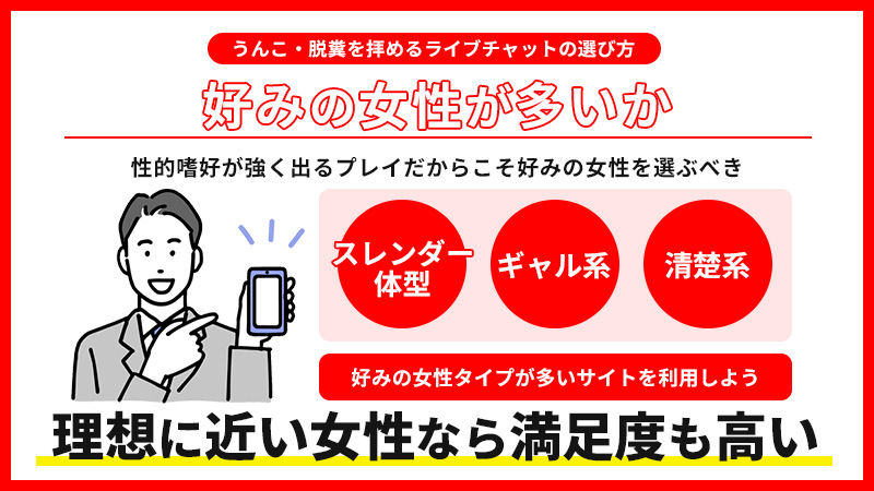 スカトロは、性的嗜好が強く出るプレイだからこそ、自分の好みに合う女性が多いサイトを選ぶのが重要です。
