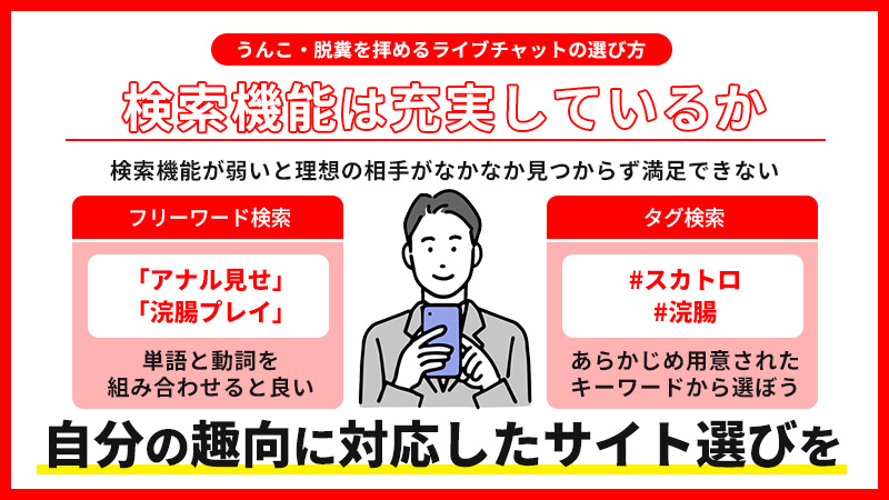 「スカトロ」や「浣腸」といったフェチ向けのタグが存在するサイトであれば、理想の相手をすぐに見つけられることもあるでしょう。