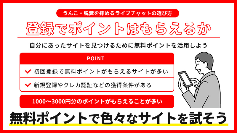 新規登録でポイントがもらえるライブチャットなら、初回は無料でうんこや脱糞プレイを試せる可能性があります。