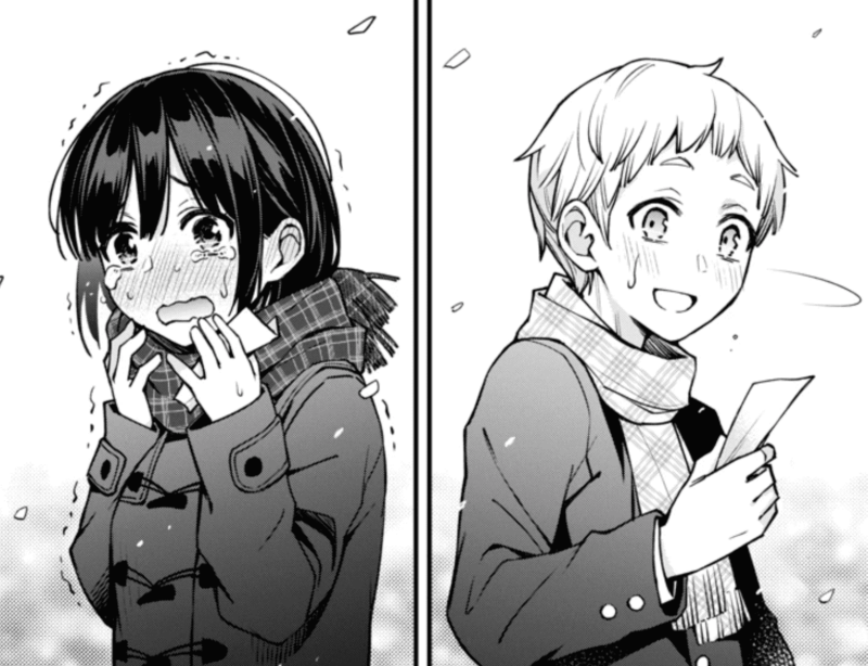 合格発表の掲示板を見て、喜びをかみしめる、かなちゃんとアキくん。