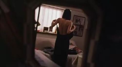 このシーンはサスペンスの緊張感とエロティックな空気が混じり合い、観る者の視線を強く引きつけます。